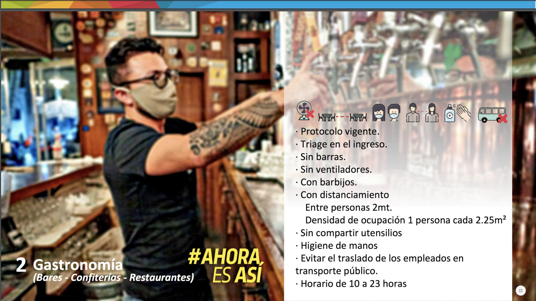 Los bares y los restaurantes tendrán una habilitación del 50% del total de mesas. Sólo podrán trabajar de 10 a 23 y no estarán permitidas las barras.